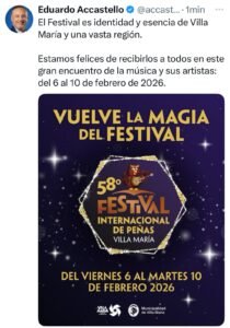 “El Festival es identidad y esencia de Villa María y una vasta región. Estamos felices de recibirlos a todos en este gran encuentro de la música y sus artistas: del 6 al 10 de febrero de 2026”, expresó el jefe municipal en su publicación.